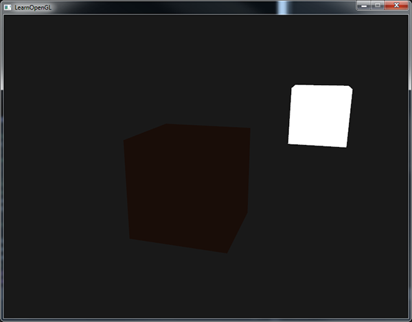 如果你现在运行你的程序,你会注意到冯氏光照的第一个阶段已经应用到你的物体上了。这个物体非常暗,但由于应用了环境光照(注意光源立方体没受影响是因为我们对它使用了另一个着色器),也不是完全黑的。它看起来应该像这样:
