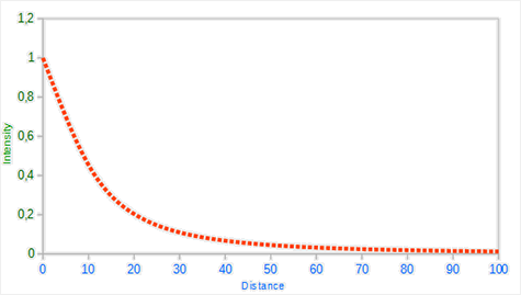 你可以看到光在近距离的时候有着最高的强度,但随着距离增长,它的强度明显减弱,并缓慢地在距离大约100的时候强度接近0。这正是我们想要的。