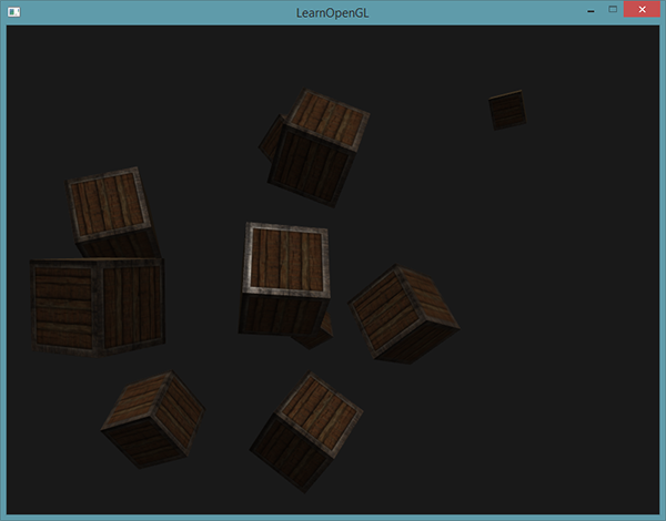 如果你将10个箱子加入到上一节光照场景中,你会注意到在最后面的箱子和在灯面前的箱子都以相同的强度被照亮,并没有定义一个公式来将光随距离衰减。我们希望在后排的箱子与前排的箱子相比仅仅是被轻微地照亮。