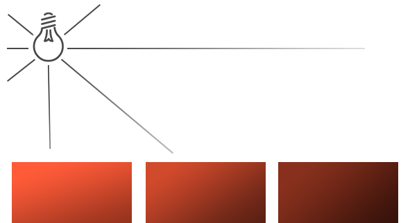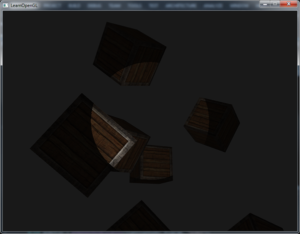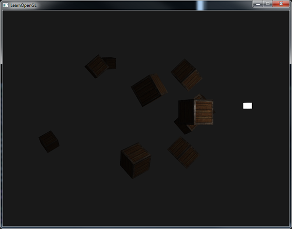 你可以看到,只有前排的箱子被照亮的,距离最近的箱子是最亮的。后排的箱子一点都没有照亮,因为它们离光源实在是太远了。你可以在这里找到程序的代码。