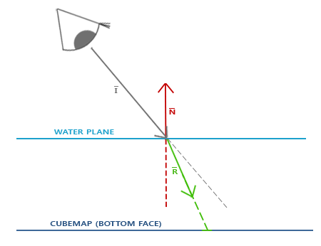 反射的原理并不难。下面这张图展示了我们如何计算反射向量,并如何使用这个向量来从立方体贴图中采样: