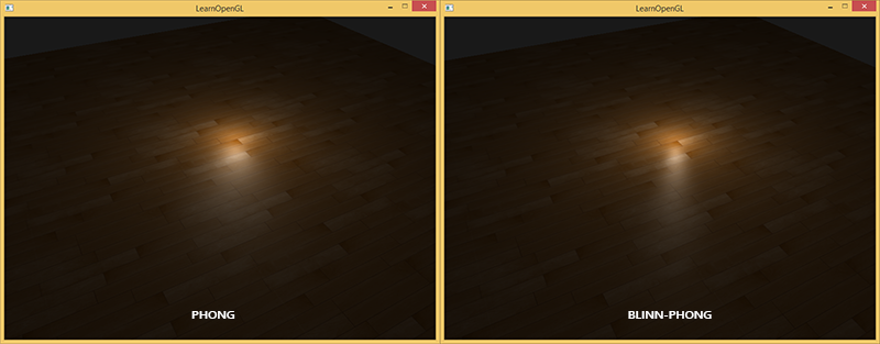 在引入半程向量之后,我们现在应该就不会再看到冯氏光照中高光断层的情况了。下面两个图片展示的是两种方法在镜面光分量为0.5时的对比: