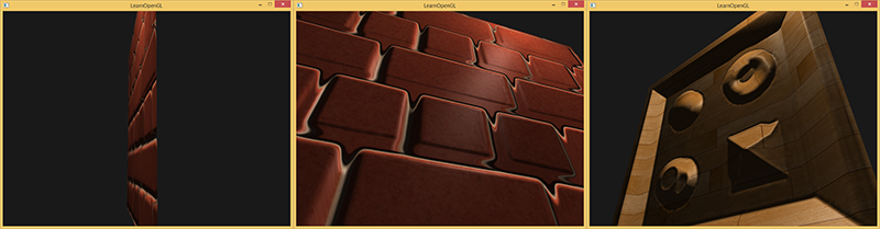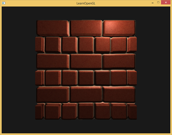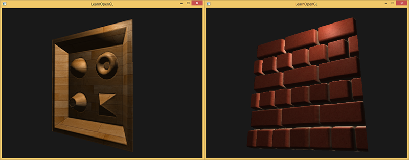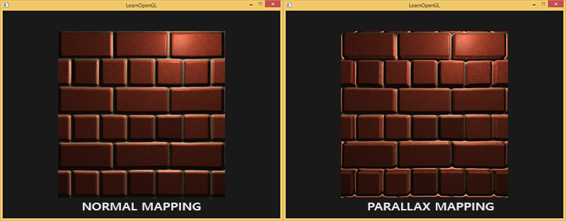 这里你会看到只用法线贴图和与视差贴图相结合的法线贴图的不同之处。因为视差贴图尝试模拟深度,它实际上能够根据你观察它们的方向使砖块叠加到其他砖块上。