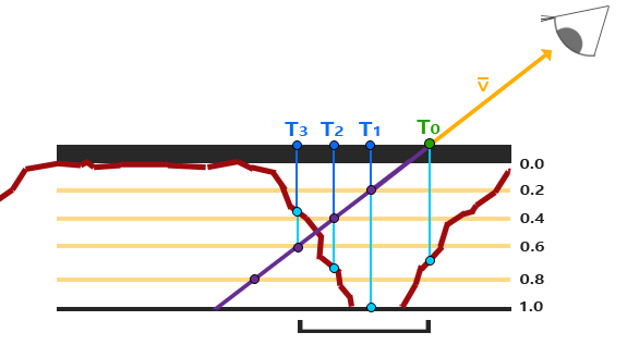 然后我们遍历所有层,从上开始,知道找到小于这一层的深度值的深度贴图值: