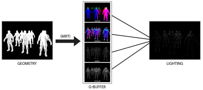 在几何处理阶段中填充G缓冲非常高效,因为我们直接储存像素位置,颜色或者是法线等对象信息到帧缓冲中,而这几乎不会消耗处理时间。在此基础上使用多渲染目标(Multiple Render Targets, MRT)技术,我们甚至可以在一个渲染处理之内完成这所有的工作。