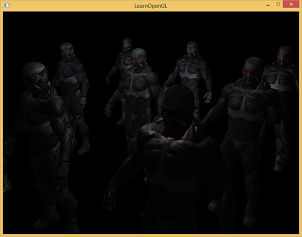 如果我们现在想要渲染一大堆纳米装战士对象到gBuffer帧缓冲中,并通过一个一个分别投影它的颜色缓冲到铺屏四边形中尝试将他们显示出来,我们会看到向下面这样的东西: