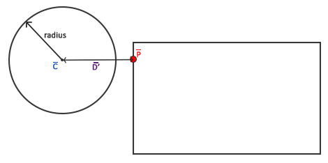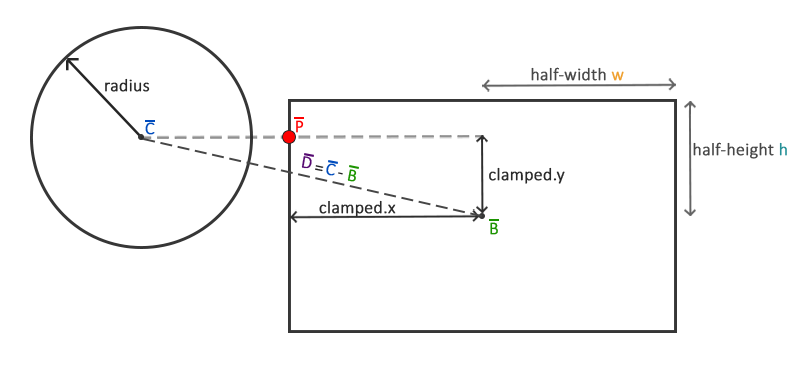 这意味着我们不得不修改检测算法,因为当前的算法只适用于两个AABB的碰撞。检测圆和AABB碰撞的算法会稍稍复杂,关键点如下:我们会找到AABB上距离圆最近的一个点,如果圆到这一点的距离小于它的半径,那么就产生了碰撞。