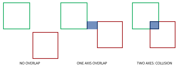 我们检查第一个物体的最右侧是否大于第二个物体的最左侧并且第二个物体的最右侧是否大于第一个物体的最左侧;垂直的轴向与此相似。如果您无法顺利地将这一过程可视化,可以尝试在纸上画边界线/长方形来自行判断。