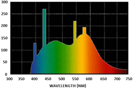 辐射通量:辐射通量表示的是一个光源所输出的能量,以瓦特为单位。光是由多种不同波长的能量所集合而成的,而每种波长则与一种特定的(可见的)颜色相关。因此一个光源所放射出来的能量可以被视作这个光源包含的所有各种波长的一个函数。波长介于390nm到700nm(纳米)的光被认为是处于可见光光谱中,也就是说它们是人眼可见的波长。在下面你可以看到一幅图片,里面展示了日光中不同波长的光所具有的能量: