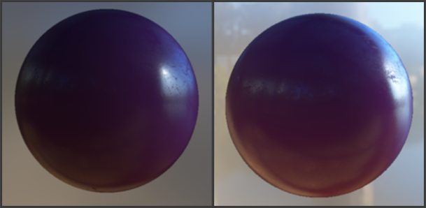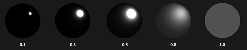 我们可以看到,较高的粗糙度值显示出来的镜面反射的轮廓要更大一些。与之相反地,较小的粗糙值显示出的镜面反射轮廓则更小更锐利。