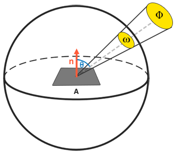 在理解了辐射通量,辐射强度与立体角的概念之后,我们终于可以开始讨论辐射率的方程式了。这个方程表示的是,一个拥有辐射强度的光源在单位面积,单位立体角上的辐射出的总能量: