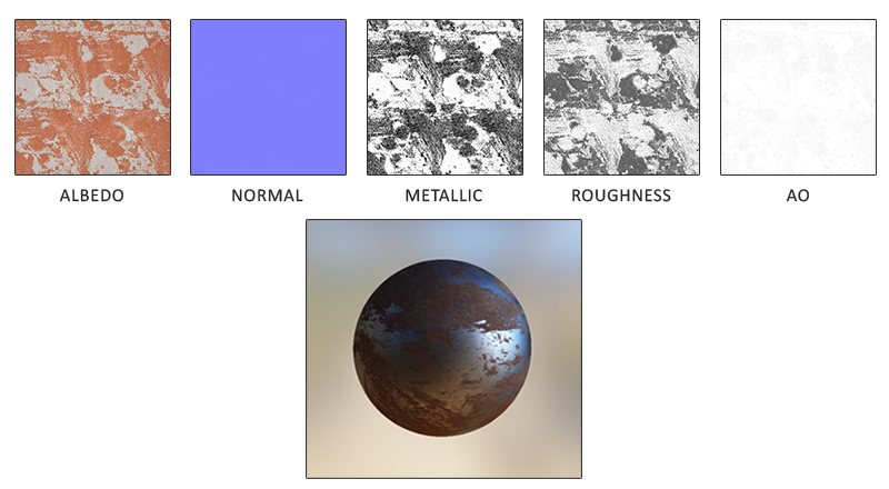 在下面你可以看到在一个PBR渲染管线当中经常会碰到的纹理列表,还有将它们输入PBR渲染器所能得到的相应的视觉输出: